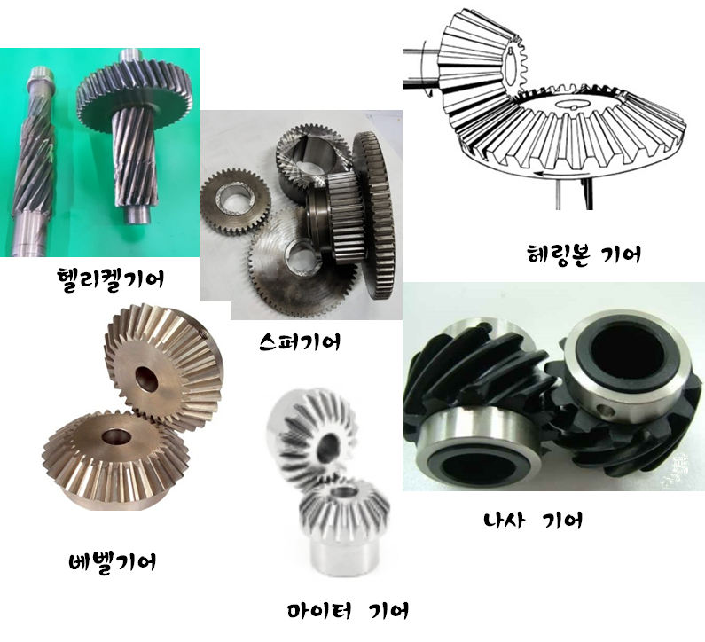 - 헬리컬 기어(Helical gear)- 이 끝이 헬리컬 선을 가지는 원통 기어이며, 보통 평행한