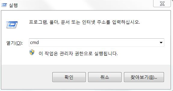 우선 윈도우키+R 키를 눌러 다음과 같은 실행창을 실행시켜서 cmd를 입력하여