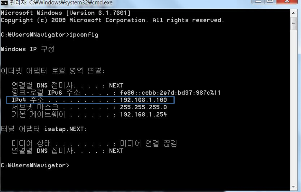 명령 프롬포트창에 들어가서 ipconfig라고 입력후 Enter를 누립니다.
