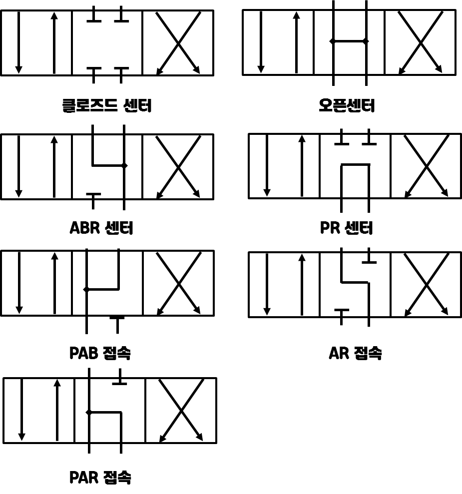 - 중립위치로서 모든 포트가 폐쇄되고 유로가 전부 차단되는 형태이다.