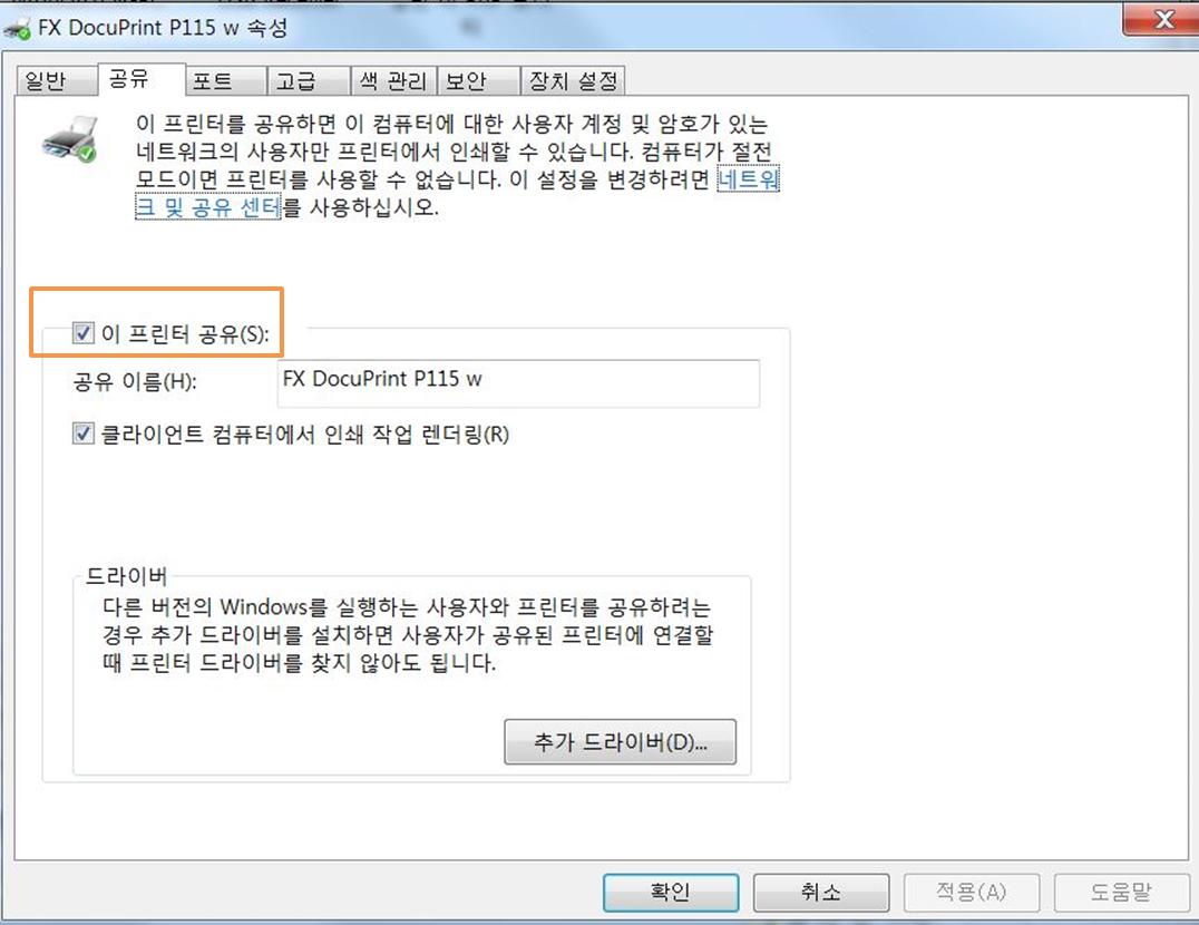 공유 탭에서 중간부에 있는 프린터 공유 항목 체크박스를 선택한 후 공유될 프린터의 이름을 지정합니다.