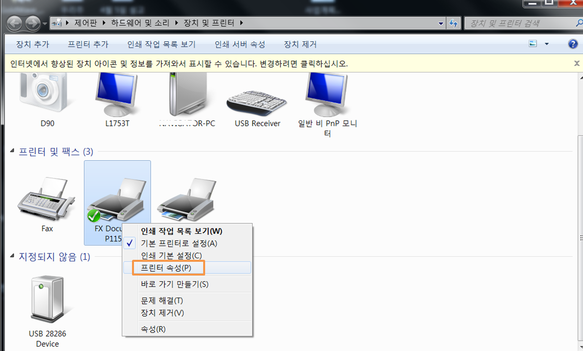 해당 프린터에서 우 클릭을 하여 프린터 속성에 들어갑니다.