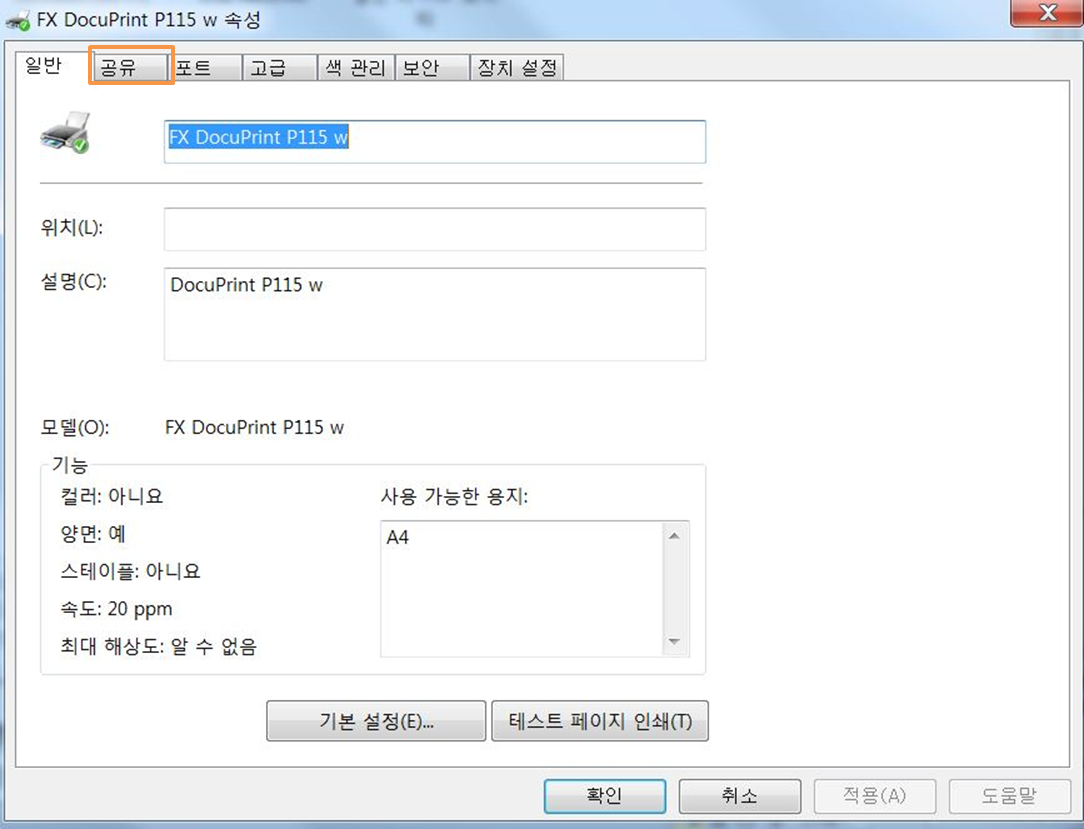 프린터 속성 창이 뜨면 상단 메뉴 중 공유 탭을 선택합니다.