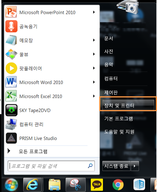시작 메뉴가 나타나면 오른쪽에 있는 장치 및 프린터를 눌러줍니다.