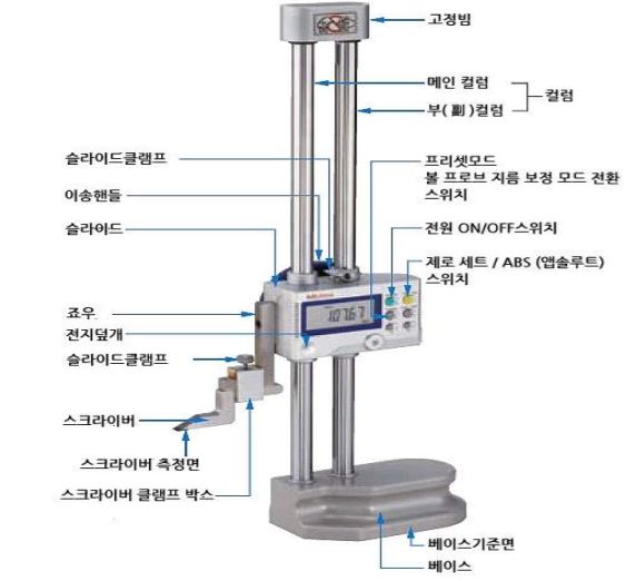 조합된 측정기이다. 주로 부품 또는 제품의 높이 등을 측정할 때 사용된다.