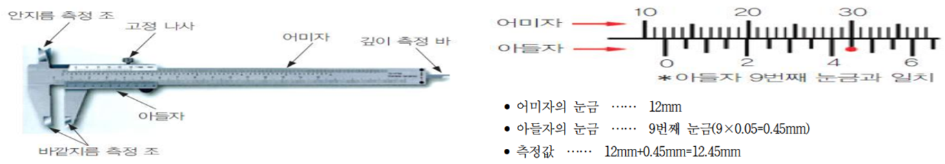 - 버니어 캘리퍼스는 이미지와 아들자를 이용하여 0.05mm까지 정밀하게 측정하는