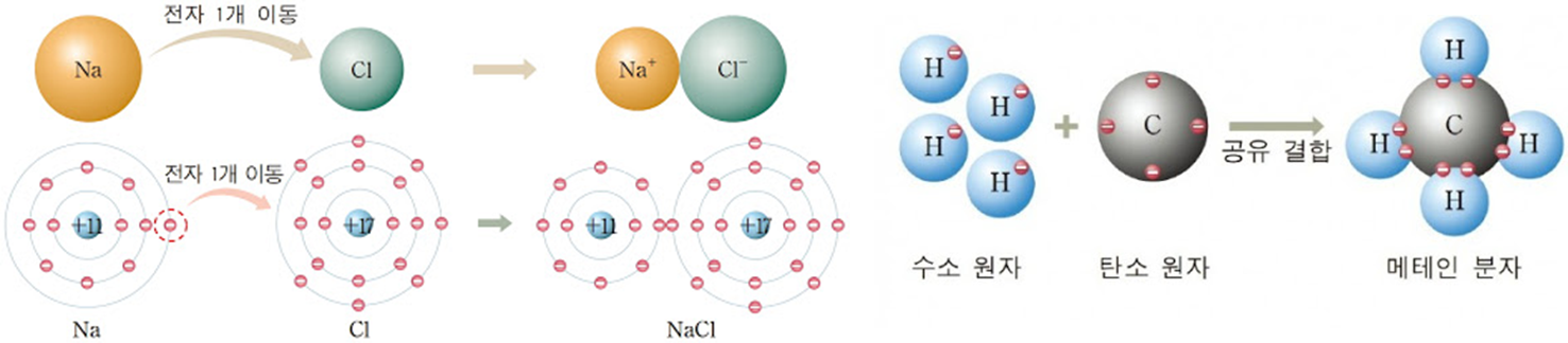 결합으로 전자를 방출하여 양이온으로 된 원자와 전자를 최외각에 받아