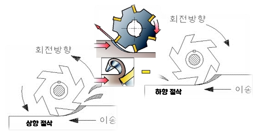 -밀링 커터의 진행 방향과 테이블의 이송 방향이 반대이므로 이송