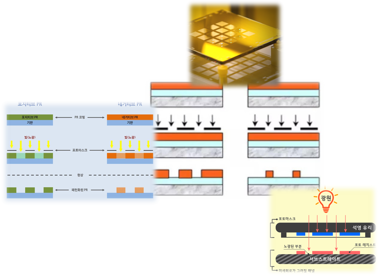 위에 패턴이 그려진 마스크를 놓고 노광 하면 빛을 받은 부분만 화학적으로