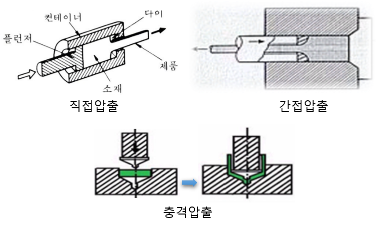 소성이 큰 재료를 강력한 압력으로서 각종 형상을 한 다이에 통과시켜 가공하는 방식을