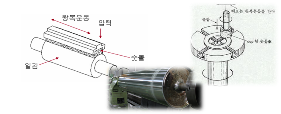 ▶직선 왕복, 회전운동 및 진동을 숫돌에 주어 외면과 평면 등 매끈하게 연삭하는 가공