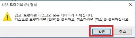 경고 메시지가 다음과 같이 뜹니다 이때 확인 버튼을 누르면 USB가 포맷이 완료가 됩니다.