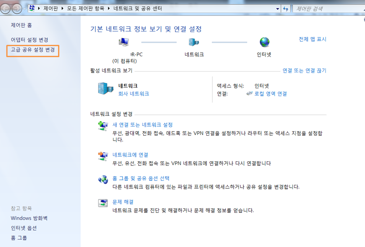 네트워크가 보이면 그곳에 있는 네트워크 및 공유 센터 열기를 클릭합니다.