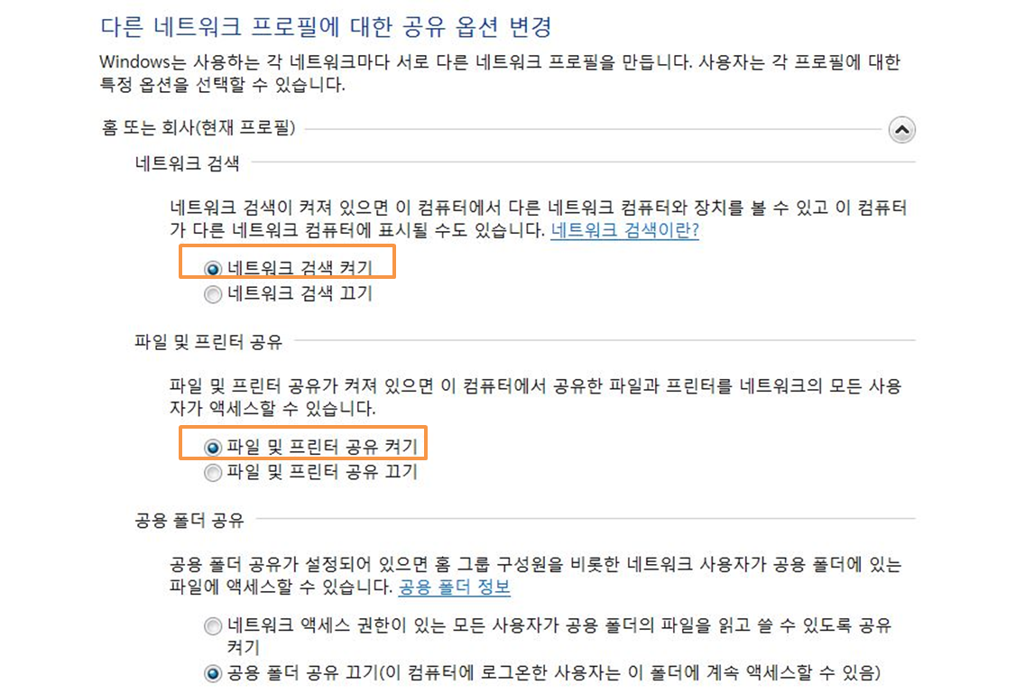 고급 공유 설정 화면이 뜨면 아래와 같이 네트워크 검색 켜기를 선택해 주시고, 파일 및 프린터 공유 항목도 눌러줍니다.