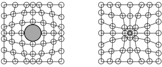 으로 결정격자에 뒤틀림 형상이 생기고 이에 따라 격자의 원자의 근처에 응력장이 형성
