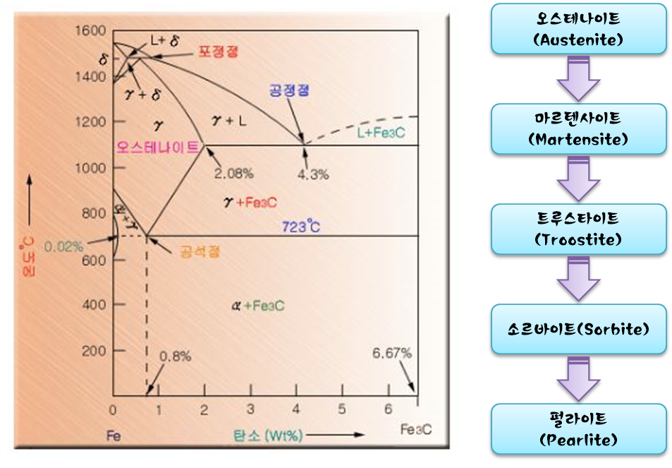 페라이트(Pearlite) : 오스테나이트(Austenite) 가 페라이트(Ferrite)와 시멘타이트