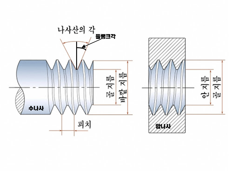 ▶ 플랭크각 : 플랭크와 축선에 직각인 직선과 맺는 각이며 나사산의 반각이라고도 표현