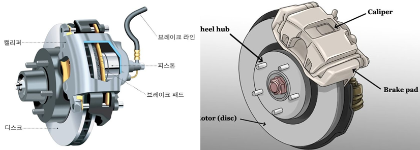 ▶ 바퀴와 함께 회전하는 원판형 디스크를 유압에 의해 작도하는 한쌍의 패드가 있고