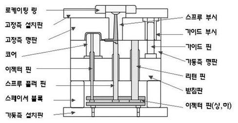 사출 금형의 구조는 다음과 같습니다.