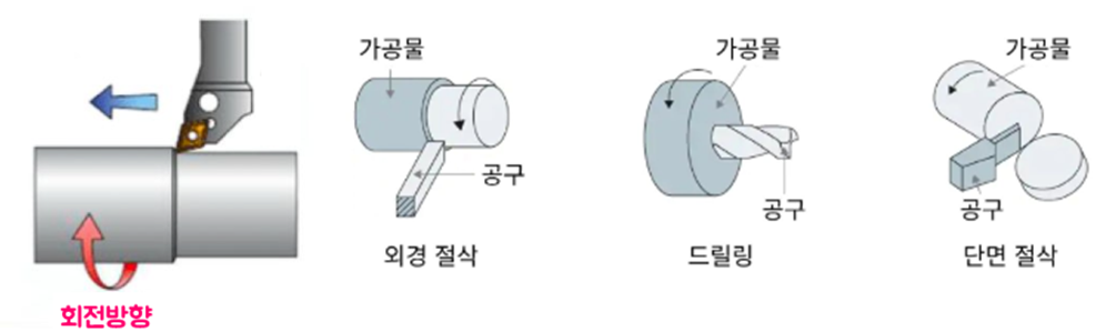 이 과정에서 공작물은 회전하며, 절삭공구는 고정된 상태에서 공작물의 표면을 절삭하는