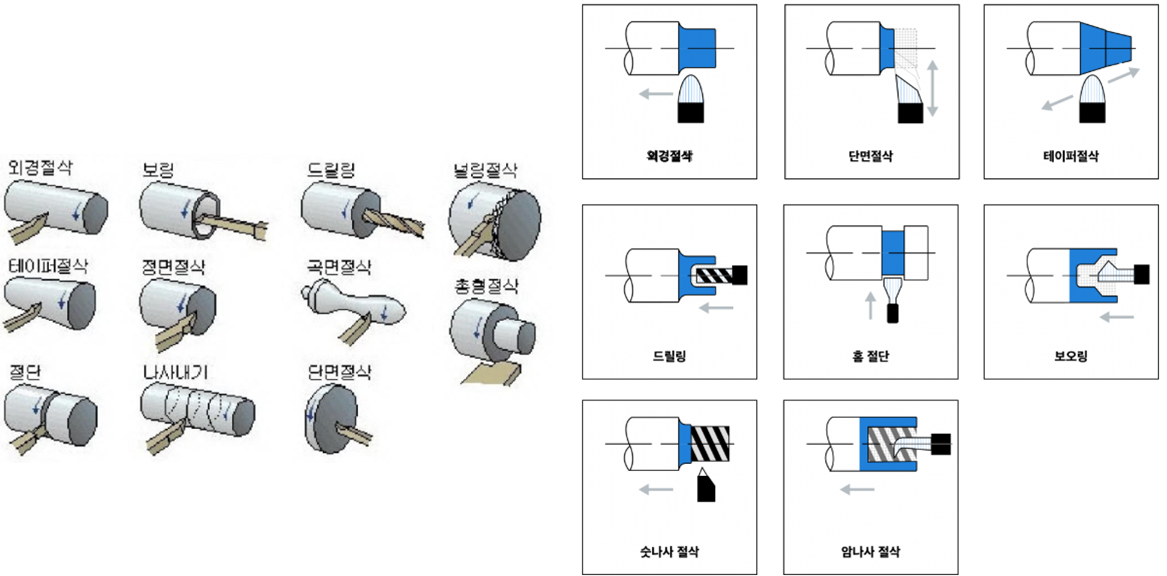 ▶선반 가공은 대표적으로 외부 가공, 내부 가공, 드릴링, 테이퍼 가공 등이 있고