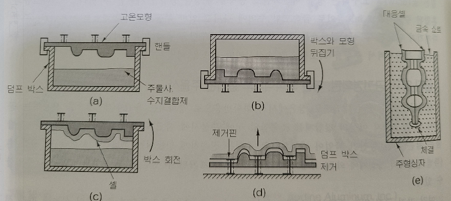 셸을 모형에서 제거한다. → (e) 대응셸을 결합하고 용탕을 주입 할 수 있도록