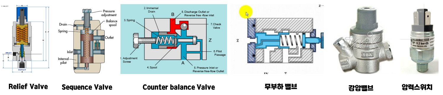 1) Relief Valve : 최고 압력을 한정하는 Valve, 회로의 압력을 일정하게 유지시키는 Valve,