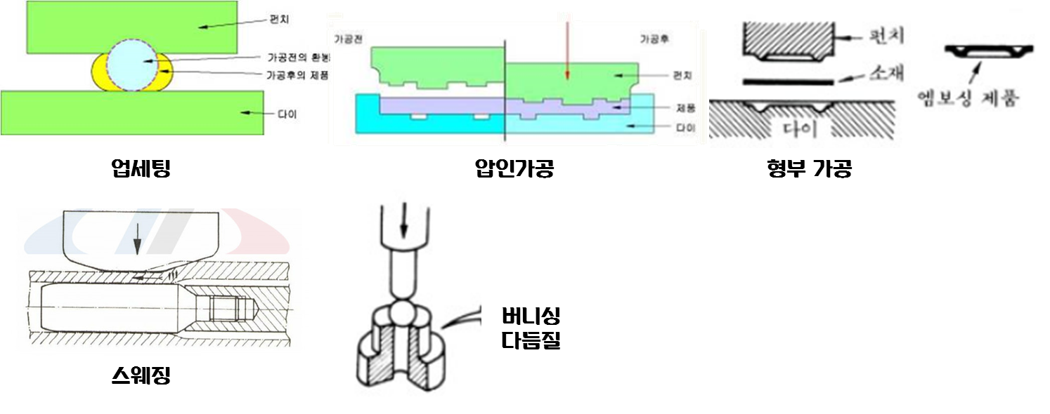 - 소재면에 요철을 만드는 성형법으로 상하의 공구에 소재를 넣고 압축력을 주어서