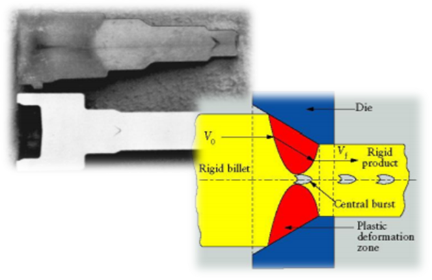 -다이내의 변형영역에서 중심선을 따라서 정수압으로 인한 인장응력 때문에 발생함.