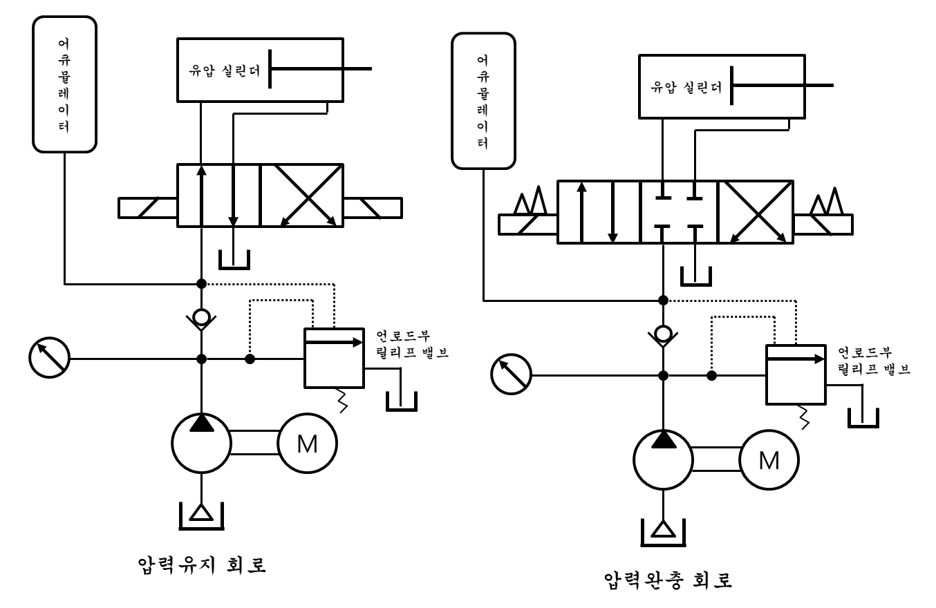 유압에너지를 축적하여 동력을 절약하거나 사이클 시간을 단축할 수 있는 회로이다.