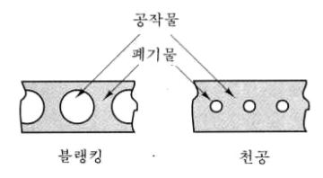 - 구멍이 없는 재료에 펀치를 때려 박아 구멍을 뚫는 가공이며