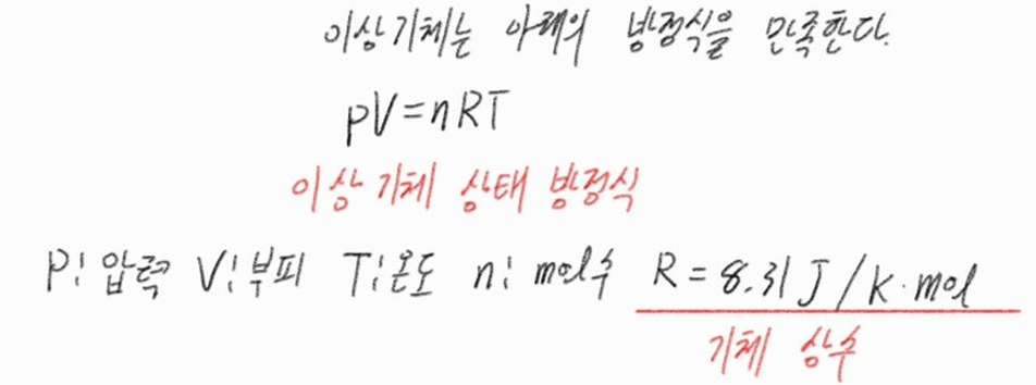 여기서 ( P )는 압력, ( V )는 부피, ( n )은 기체의 몰 수, ( R )은 이상기체 상수,