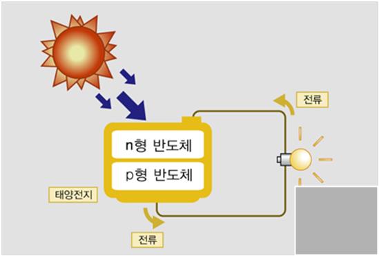 ▶ 태양빛이 P형 반도체와 N형 반도체를 접합시킨 태양전지에 쪼여지면 태양빛이 가지고
